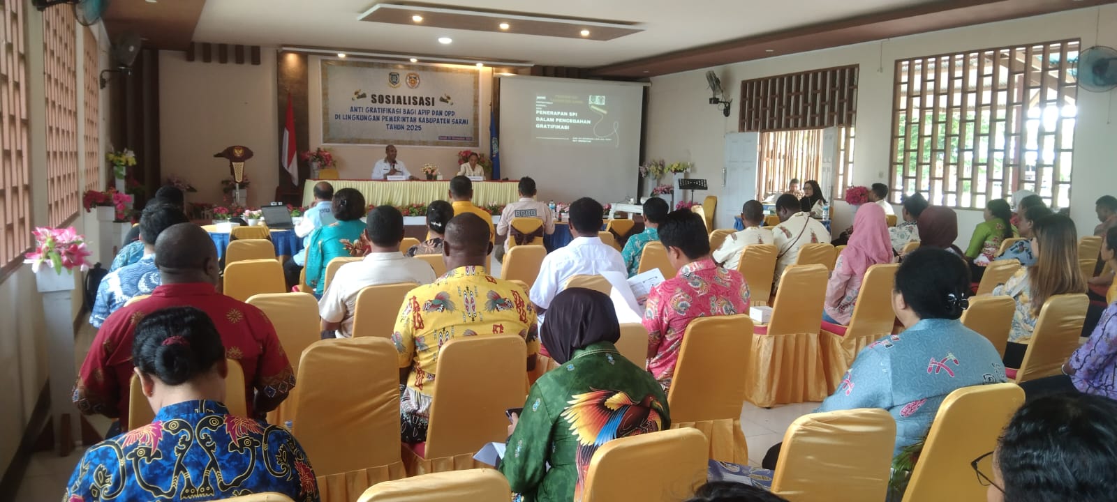 Bupati kabupaten Sarmi, Dominggus Catue,SKM. M. Kes. secara resmi membuka kegiatan Sosialisasi Anti gratifikasi bagi Aparatur pengawasan interen pemerintah (APIP) dan Organisasi perangkat daerah (OPD), di lingkungan pemerintah kabupaten Sarmi.