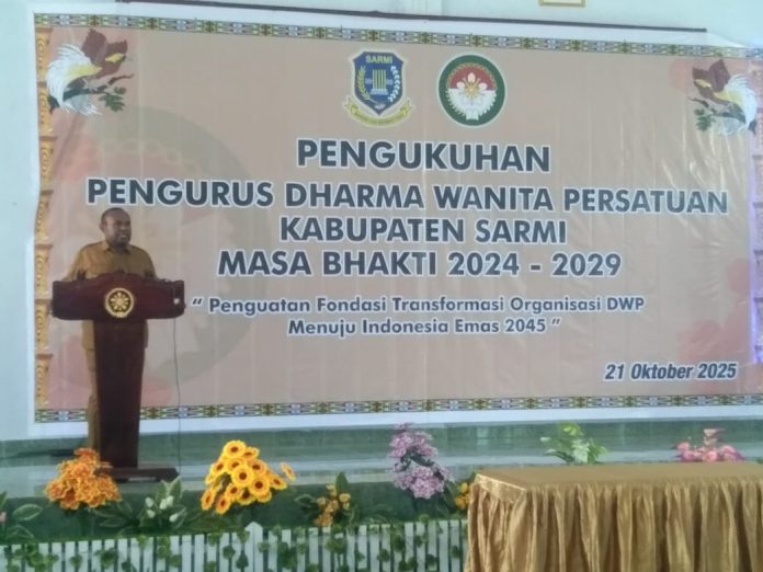KOMINFO SARMI — Bupati Sarmi, Dominggus Catue, S.K.M., M.Kes, menghadiri acara pengukuhan pengurus baru Dharma Wanita Persatuan (DWP) Kabupaten Sarmi periode 2024–2029 yang berlangsung di aula kantor bupati Sarmi, Kota Baru Petam, Selasa (21/10/2025). Kegiatan ini dihadiri oleh jajaran pemerintah daerah, PLT Sekda, serta Ketua DWP Provinsi Papua.