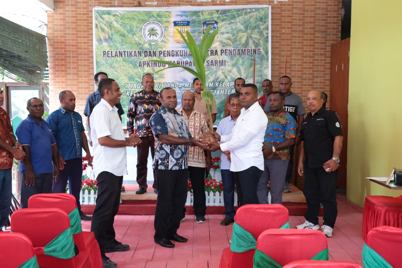 Diskominfo Sarmi—Pemerintah Kabupaten Sarmi terus mendorong penguatan sektor pertanian melalui pengembangan komoditas kelapa. Hal ini ditandai dengan pelantikan dan pengukuhan Mitra Pendamping Asosiasi Petani Kelapa Indonesia (APKINDO) Kabupaten Sarmi oleh Bupati Sarmi Dominggus Catue, S.K.M., M.Kes, bertempat di Hotel Damar Kabupaten Sarmi, Papua pada Jumat, 12/09/2025.