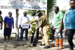 Kegiatan tersebut di pimpin Pj Bupati Sarmi Markus O. Mansnembra, SH., MM, dan dihadiri oleh intansi otonom dan vertikal, dunia usaha dan perbankan BUMN, BUMD, serta komunitas ‘Papua Trada Sampah,’ melakukan penanaman bibit pepohonan dipinggiran pantai, didahului penanaman secara simbolis oleh perwakilan, baik dari TNI, Polri, dan Pemkab Sarmi pada empat titik yang sudah disediakan.