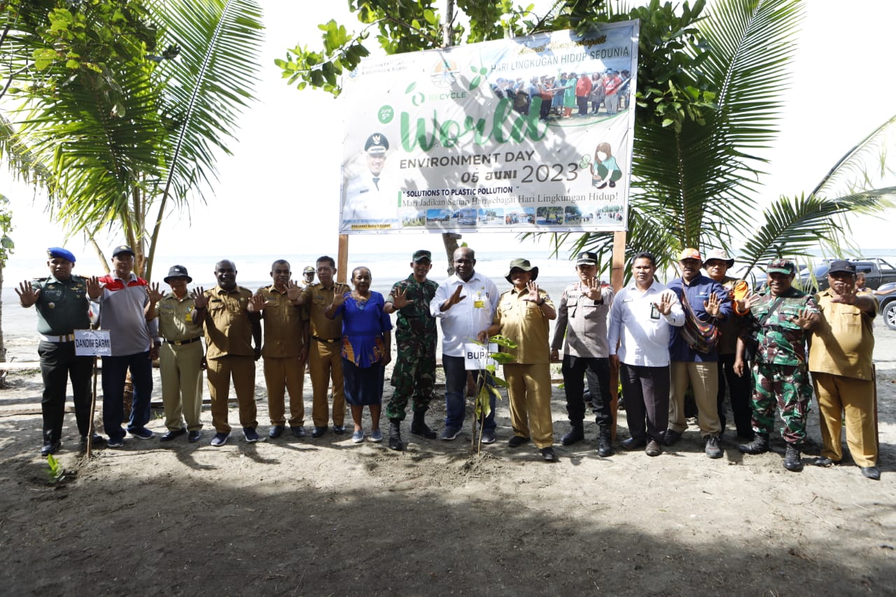 Diskominfo Sarmi – Hari Lingkungan Hidup Sedunia yang jatuh pada tanggal 5 Juni setiap tahunnya, Dinas Lingkungan Hidup Kabupaten Sarmi menggelarnya dengan mengusung tema, “Mari jadikan setiap hari sebagai hari lingkungan hidup, Solution To Plastic Polition,” peringatan hari lingkungan hidup kali ini diawali dengan Ibadah syukur yang di pimpin oleh Kepala Kementerian Agama Kabupaten Sarmi, Mikhel Dandirwalu, S.Th, bertempat di pantai Kelapa Satu, Selasa (6/6/2023).