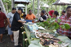 Dan akhir dari kunjungan ini, Pj Bupati Sarmi dan rombongan serta Kepala Kampung Sawar bersama masyarakat makan bersama dengan menu utama ikan bakar yang di beli langsung dari nelayan lokal Kampung Sawar.