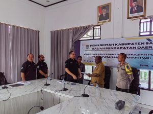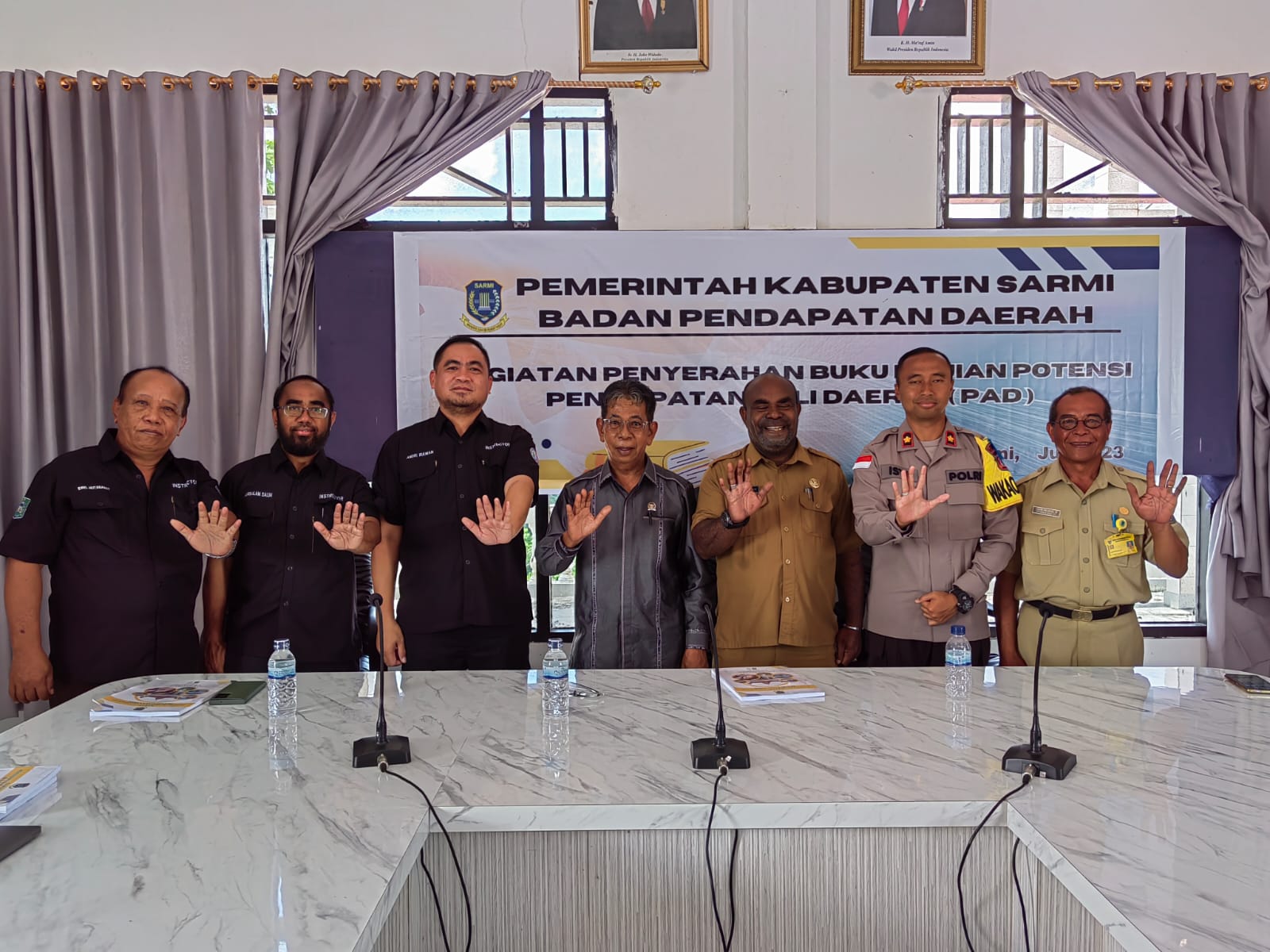 Diskominfo Sarmi -Plt. Kepala Badan Pendapatan Daerah Kabupaten Sarmi Yohanes W. Palege, S.Kom, menerima buku kajian potensi pendapatan asli daerah dari Universitas Yapis Papua, bertempat di Lantai ll Aula Kantor Bupati Sarmi, Selasa, 18/7/2023.