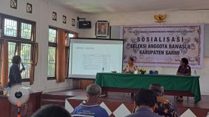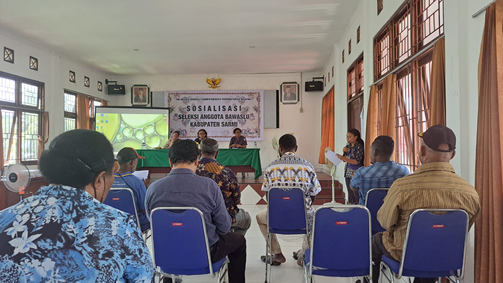 Untuk menindaklanjuti kewenangan yang telah diberikan oleh Bawaslu RI tersebut, maka Tim Seleksi Wilayah I yang diwakili oleh Dr.Kristina Sawen, SH., MH, Nancy Yoafifi, SE, dan Ar. Kelana V. Nugroho, IAI, bertempat di Aula Pertemuan Distrik Sarmi, Rabu, 24 Mei 2023 telah melakukan Sosialisasi Seleksi Anggota Bawaslu Kabupaten Sarmi yang dihadiri oleh sejumlah Tokoh Masyarakat, Tokoh Adat, Tokoh Pemuda, dan Tokoh Perempuan.